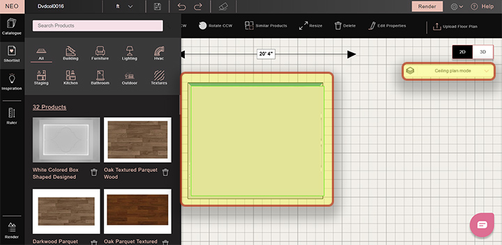 7. Click on the shortlisted ceiling. Drag and drop the ceiling on the canvas in the Ceiling plan mode.