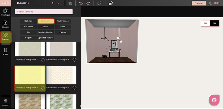 4. To view available textures click on Textures→ Wallpapers/ Wall finishes/ Wall paints/ Wood/ etc. to select a texture of your choice for your ceiling. You can either Shortlist the texture for your project by clicking on the heart-shaped icon OR directly drag and drop it to the ceiling.
